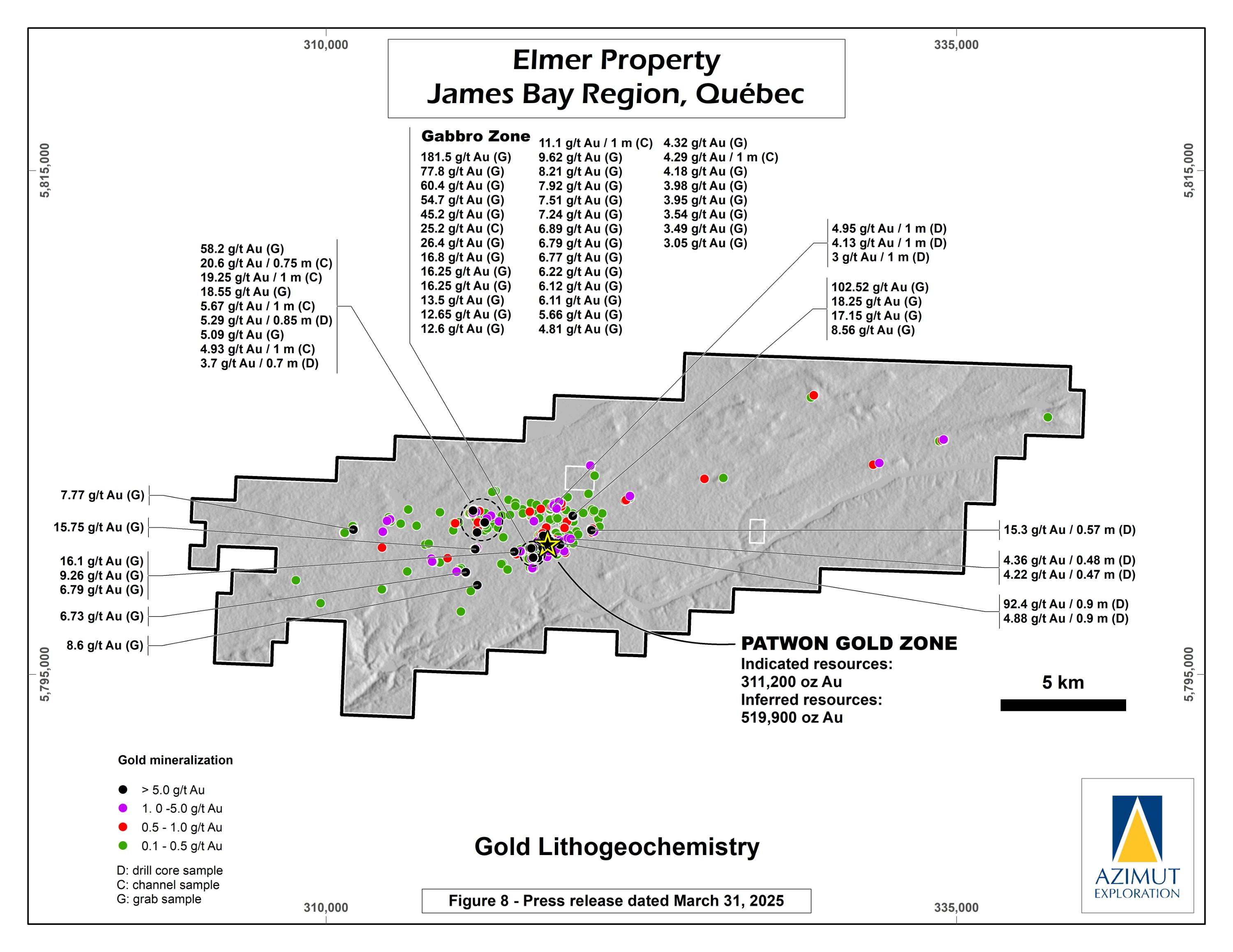 Azimut drills 3.15 g/t Au over 102.0 m including 10.1 g/t Au over 20.5 m at the Patwon Prospect, Elmer Gold Property, James Bay Region, Quebec