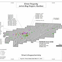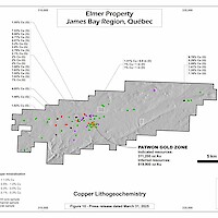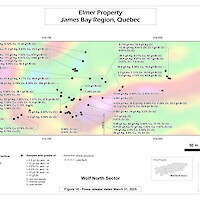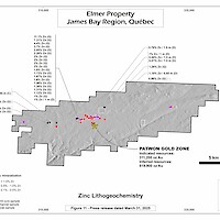- Patwon East: A 1.5-kilometre-long gold-bearing area encountered in 11 mineralized holes along the eastern strike extension of the Patwon Zone. Best intercepts include 1.35 g/t Au over 8.87 m, including 15.30 g/t Au over 0.57 m, in hole ELM22-225 and 122.0 g/t Au over 0.5 m in hole ELM21-088.