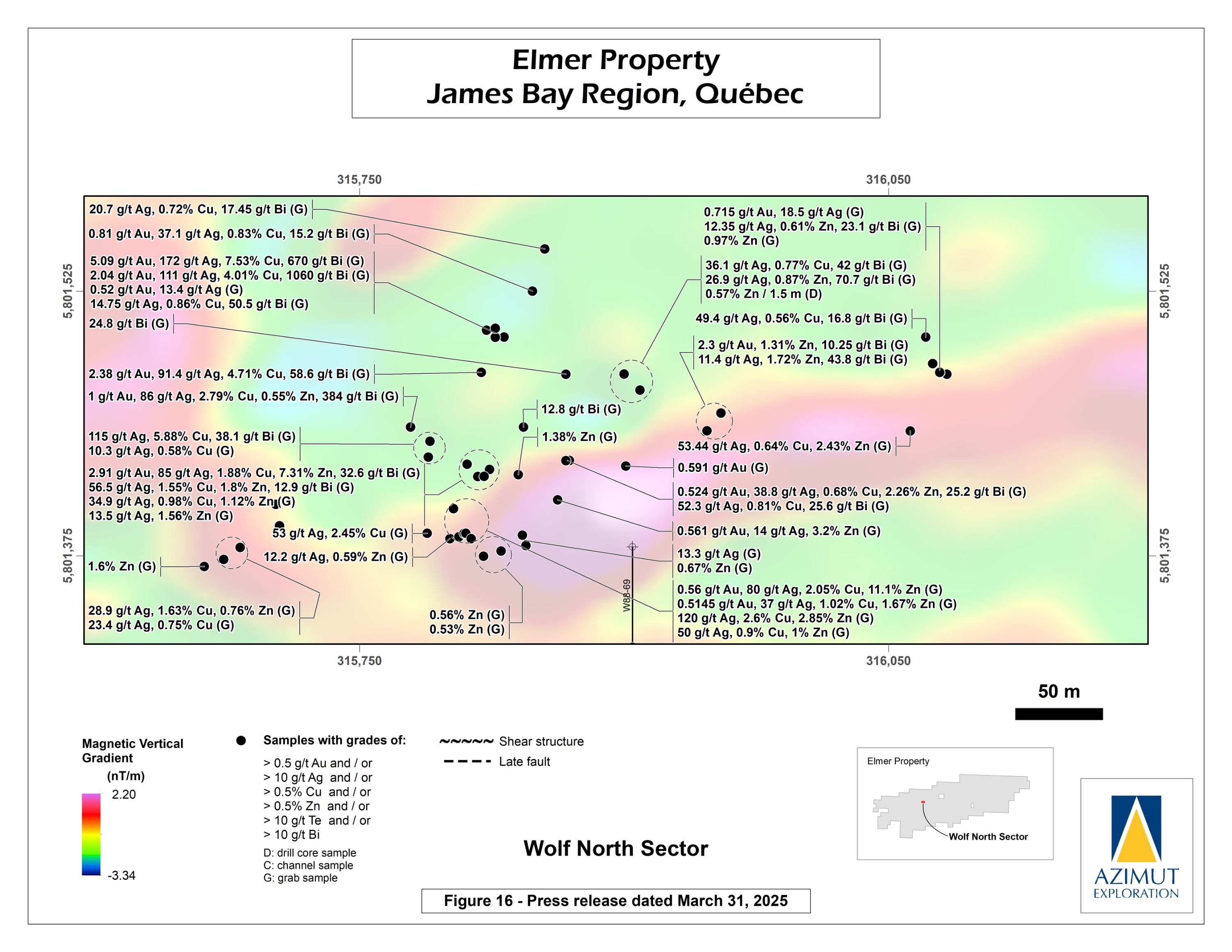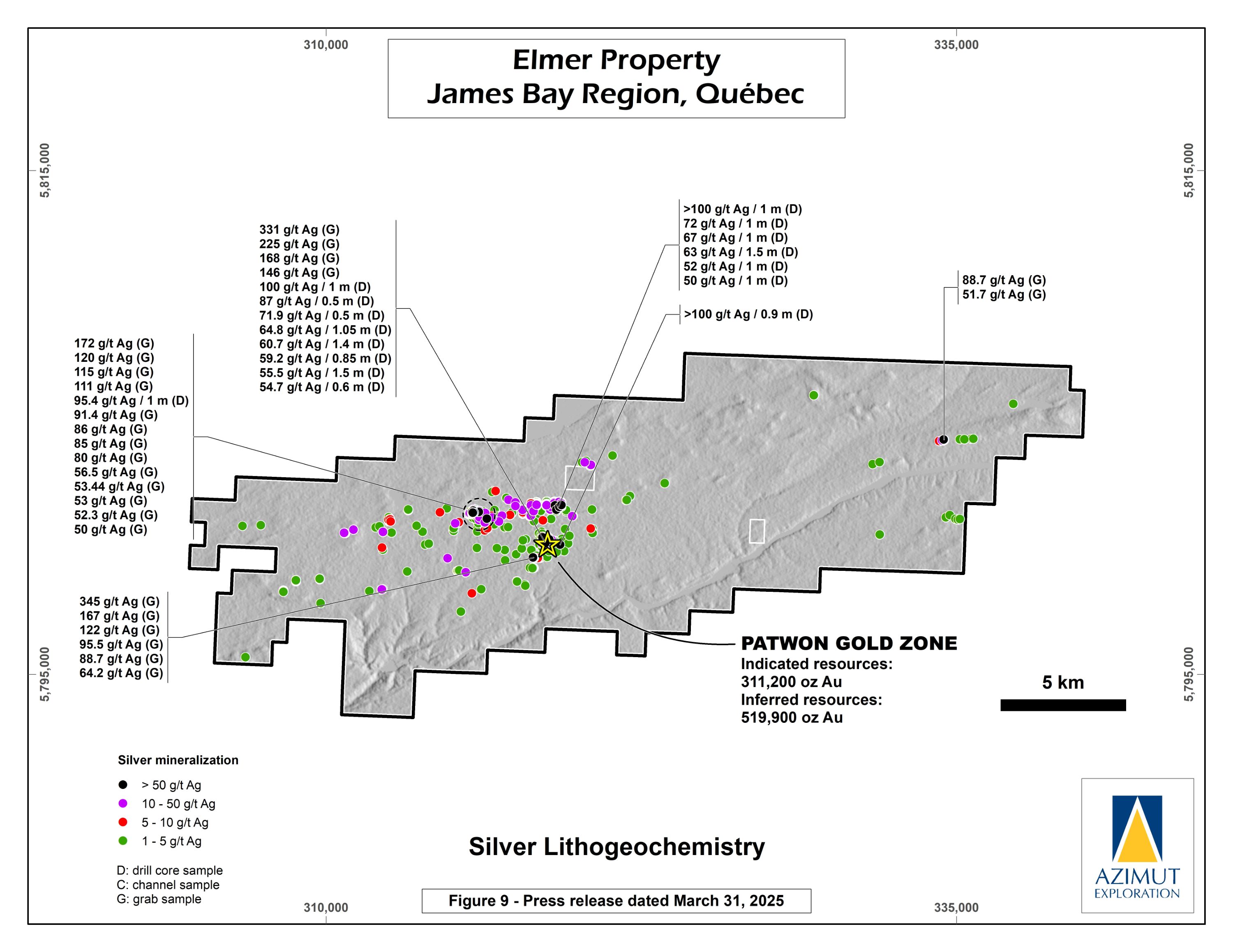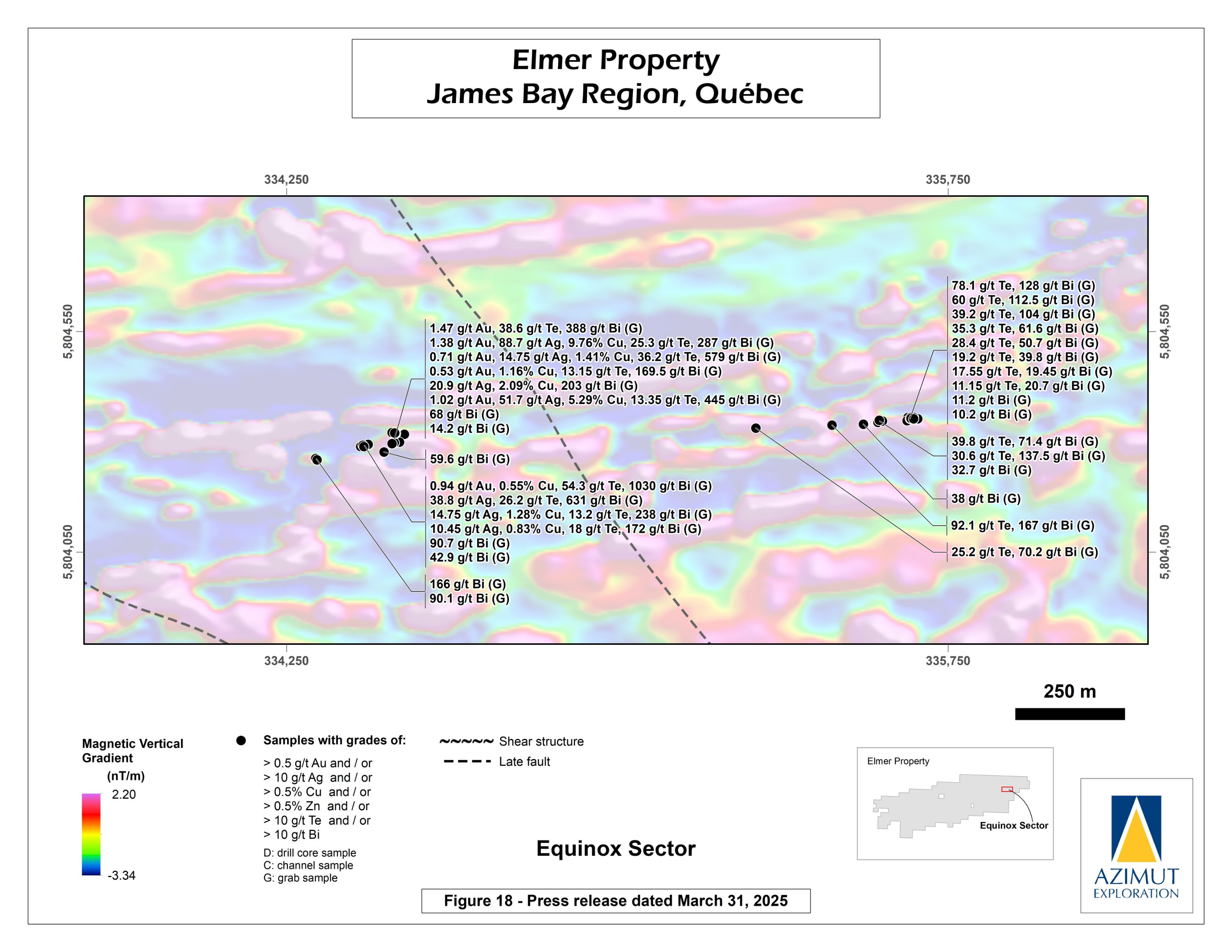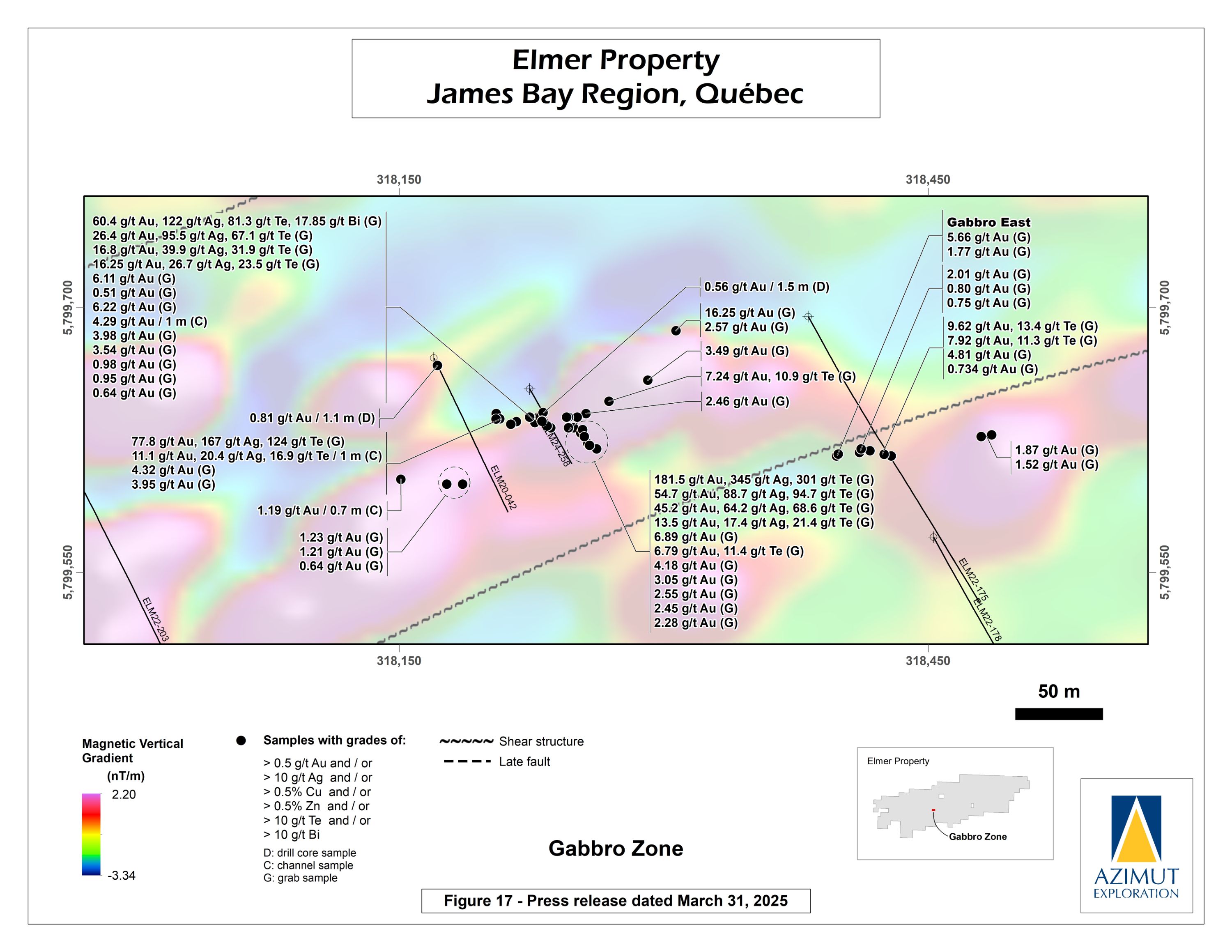 Azimut Drills 122 g/t Au, 160 g/t Ag and 307 g/t Te over 0.5 m within a 2-Kilometre-Long Target Parallel to Patwon, Elmer Property, Quebec