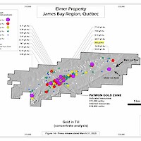 The till sampling results delineated a gold-bearing corridor roughly corresponding to the Elmer structural corridor in bedrock, which has been recognized over the 35-kilometre-long property. The gold-in-till footprint correlates well with known gold prospects. The recent analysis of RC till samples identified an attractive anomaly 3.6 kilometres east-northeast of the Patwon Gold Zone, with grades of up to 583 g/t Au from analysis of dense mineral concentrate.