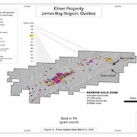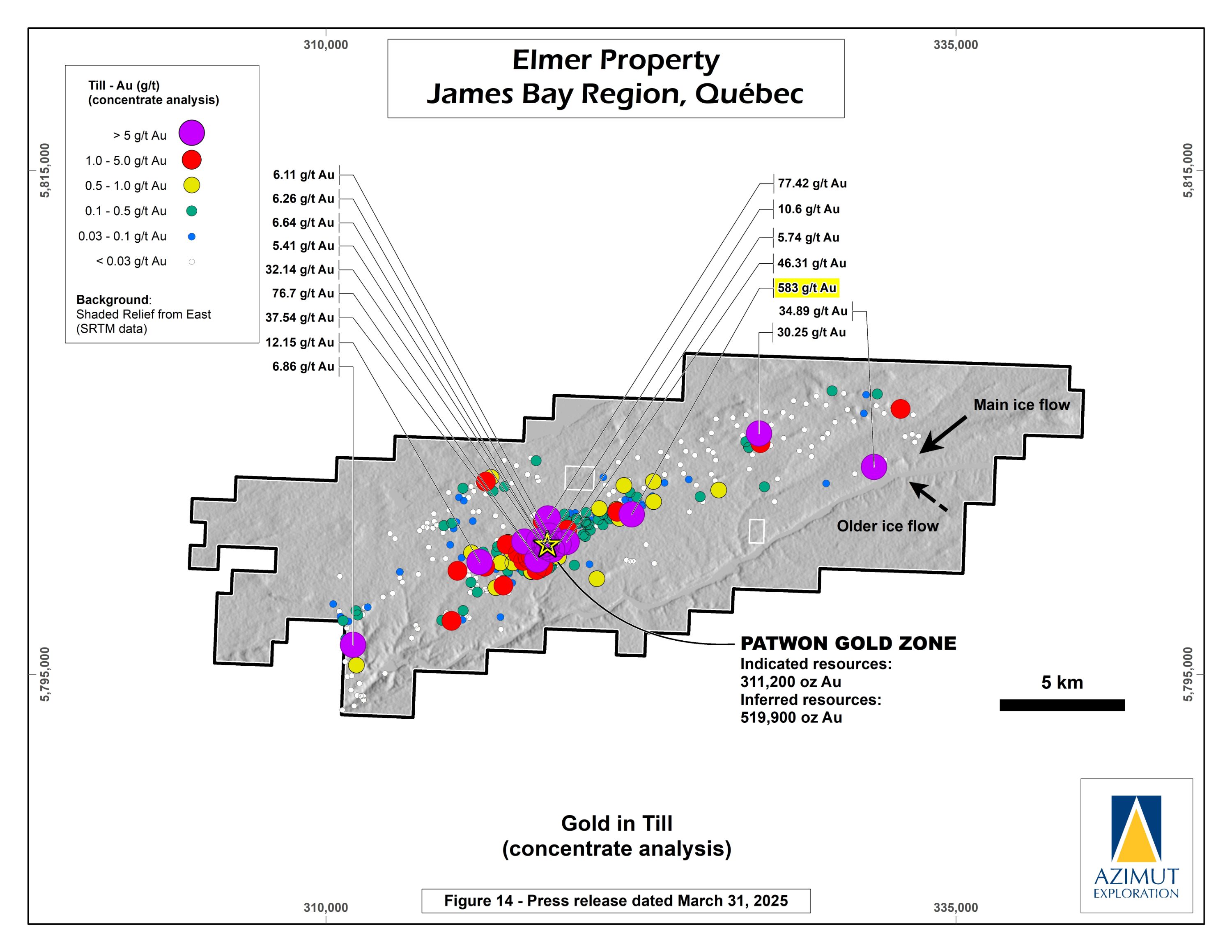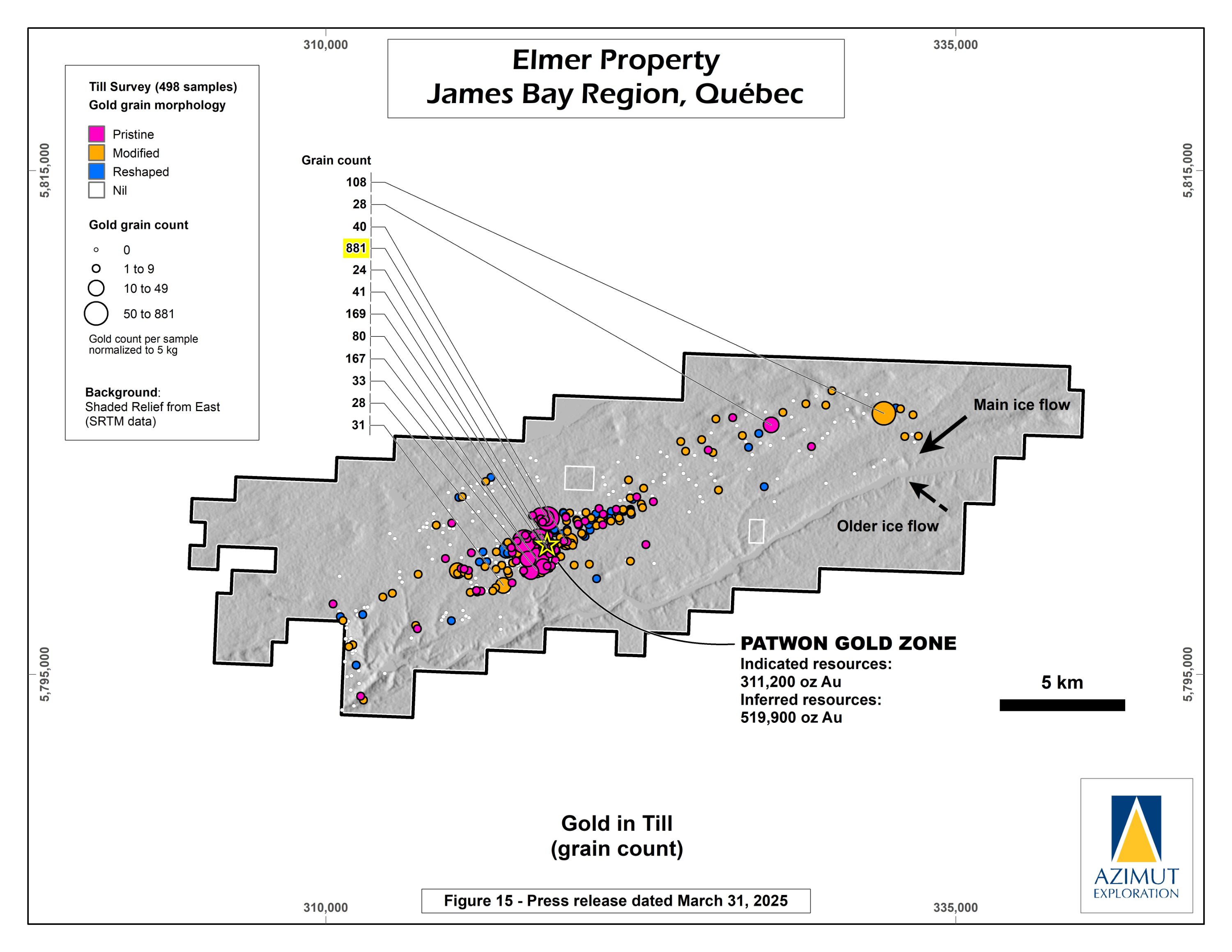 Azimut defines excellent gold targets near the Patwon Discovery on the Elmer Property, James Bay region, Quebec Up to 880 gold grains in till samples from nine gold-bearing clusters