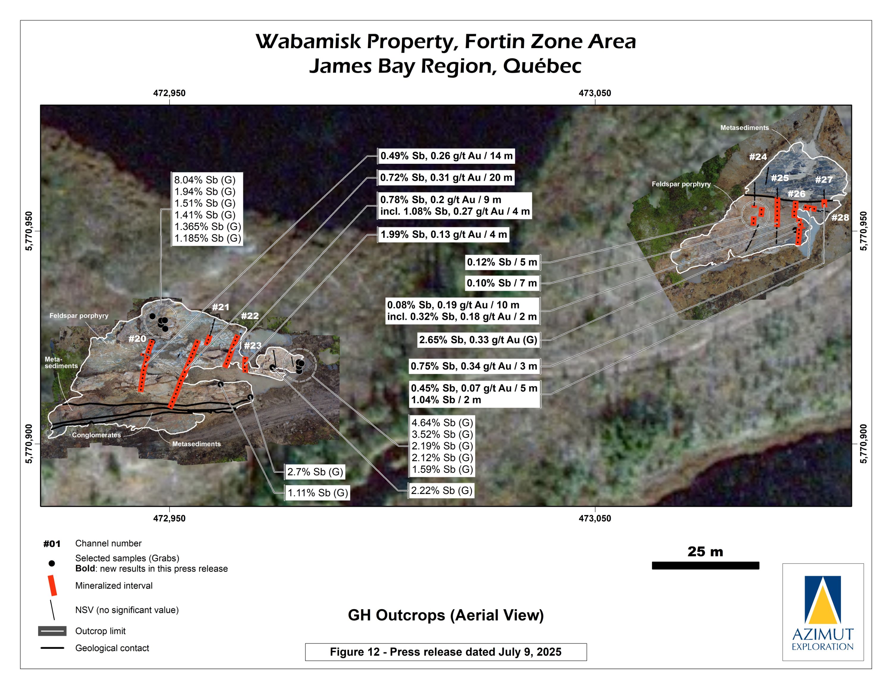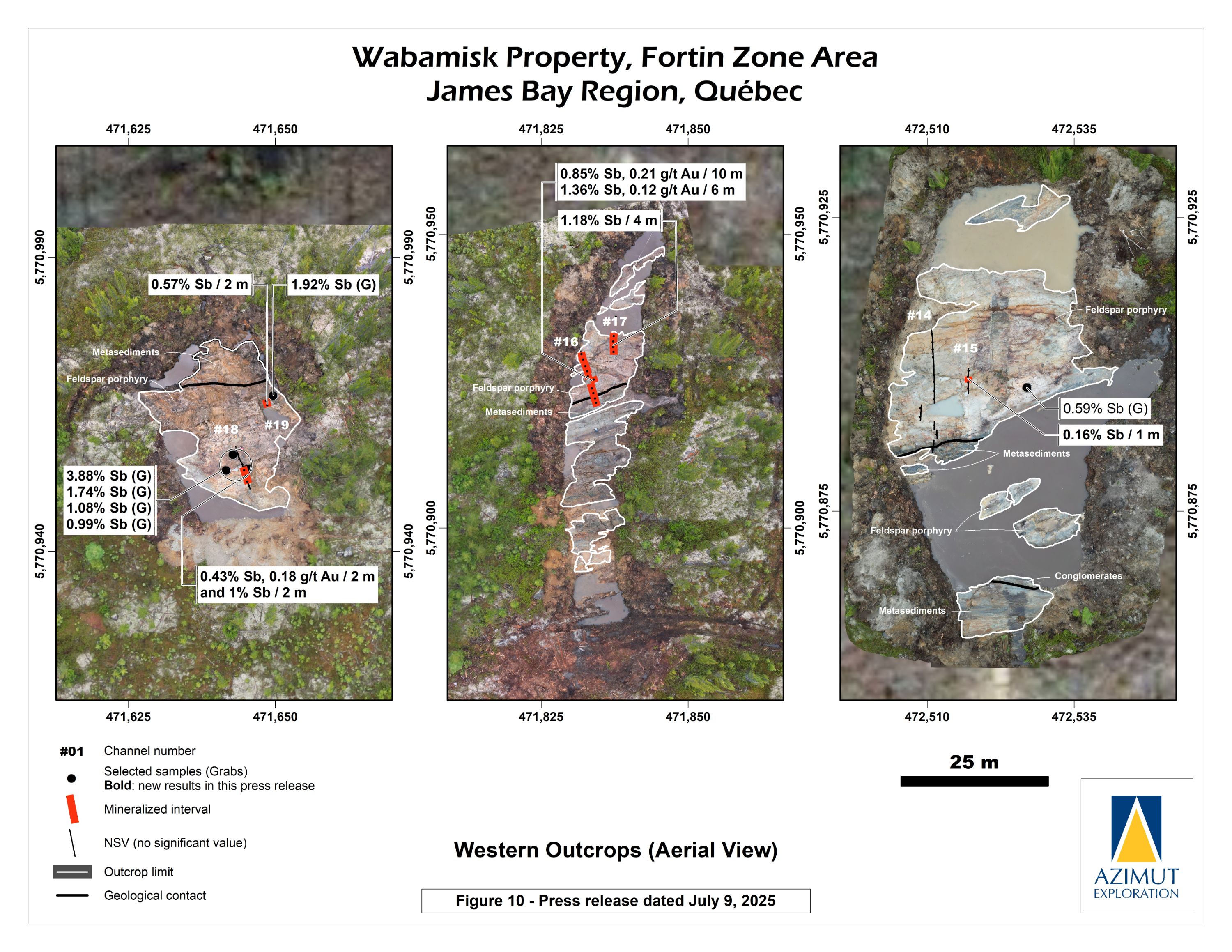 High-grade gold (up to 36.5 g/t Au over 1 m in channel WS25-02) associated with antimony was also uncovered further supporting that the gold potential of the Fortin Zone may increase at depth, a pattern already observed in other antimony-gold deposits worldwide.