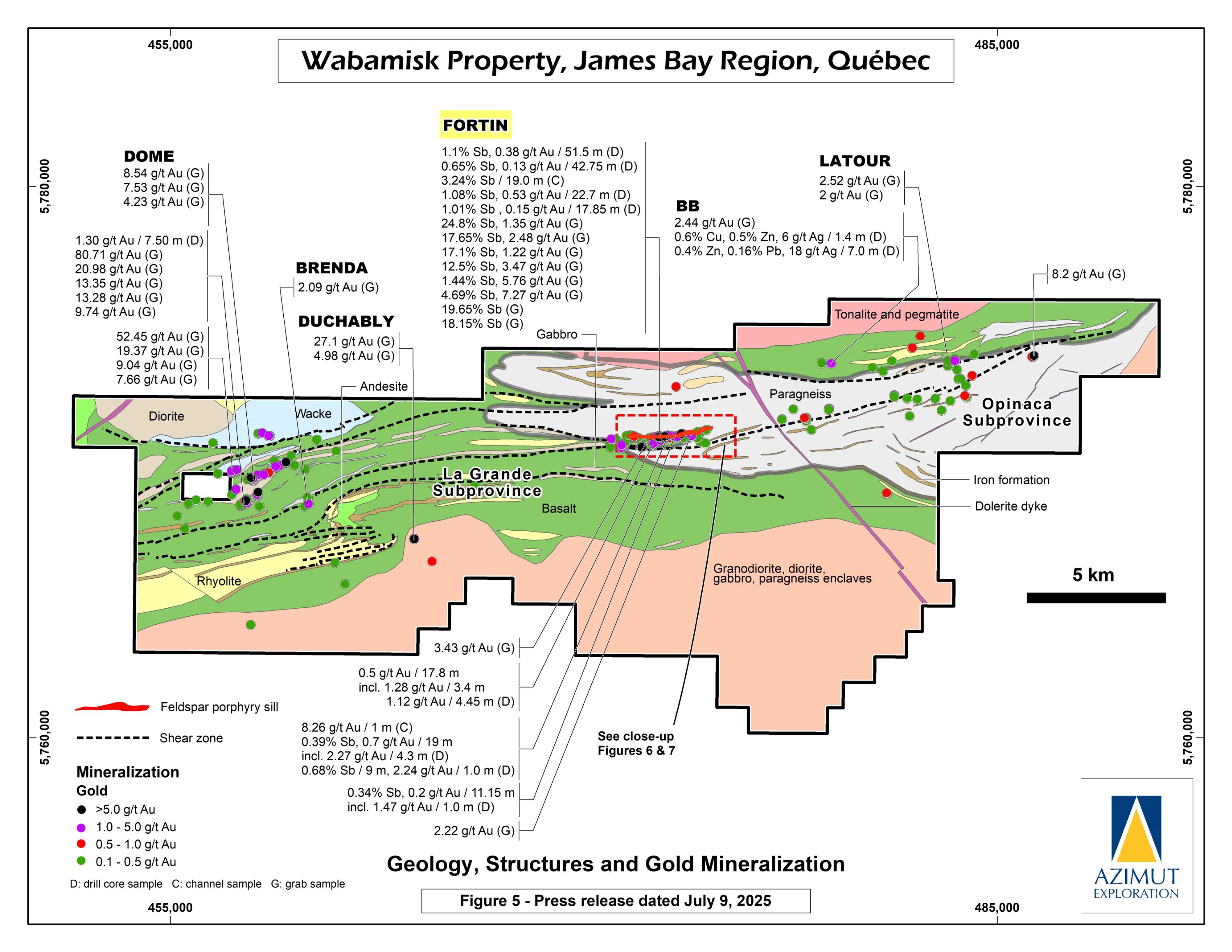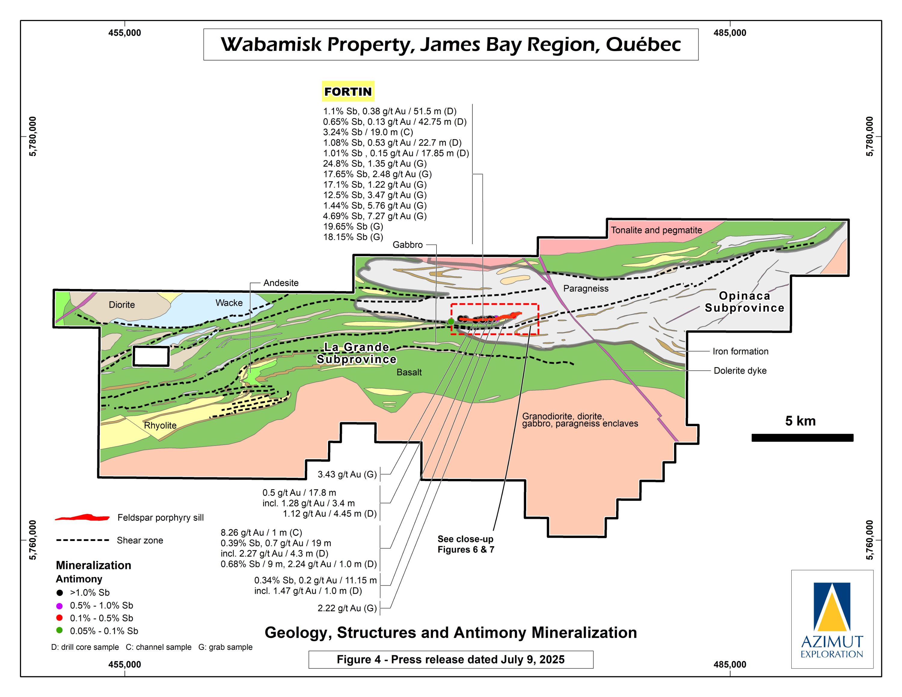 In October 2024, Azimut announced the discovery of a high-grade antimony corridor on the property with channel samples (3.92% Sb over 14.0 m) and numerous high-grade grab samples (up to 24.8% Sb) collected along a 1.2-kilometre-long strike within the Fortin Zone. Gold (up to 7.27 g/t Au in grabs) commonly accompanies antimony. Note that grab samples are selective by nature and unlikely to represent average grades. Geoscientific data (prospecting, induced polarization and magnetism, lake sediment, till and soil geochemistry) support a minimum 3.5-kilometre length for the antimony-gold exploration corridor. Significant additional work is needed to appraise its full potential.