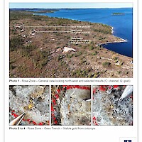 From 2012 to 2015, Newmont funded work programs that included prospecting (651 grab samples), a soil geochemistry survey (3,890 samples), an IP survey over altered shear zones that warranted additional work, and a high-resolution helicopter-borne magnetic survey (3,502 line-km). These programs led to the discovery of a new prospective area in the western part of the property characterized by gold-in-soil anomalies and an assay of 12.45 g/t Au from a quartz vein in a grab sample. Other prospecting results included 2.42% Cu, 0.41 g/t Au and 23.6 g/t Ag (grab sample); 1.42% Cu and 7.1 g/t Ag (grab sample); and 1.01% Cu, 0.67 g/t Au and 9.1 g/t Ag (boulder).