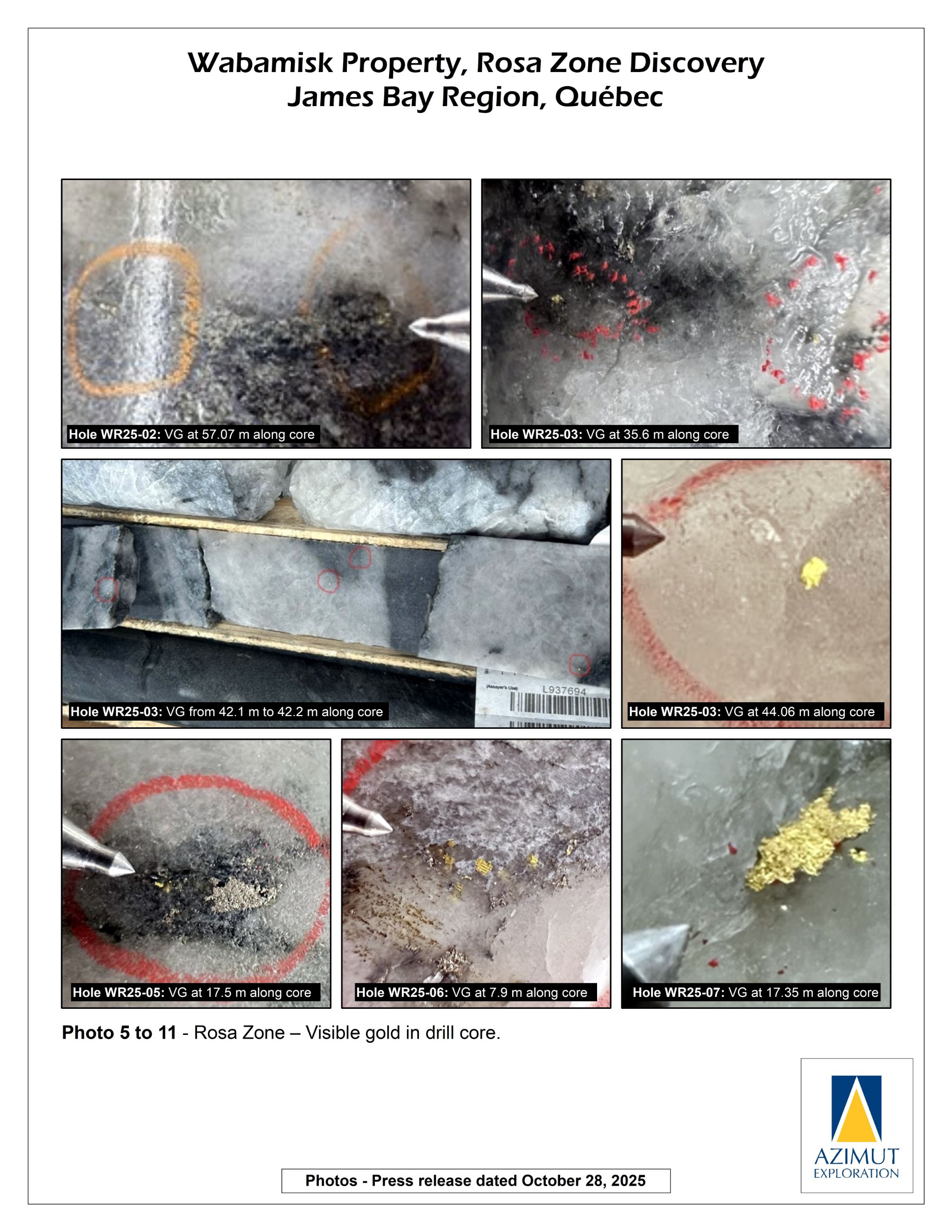 Azimut Identifies Visible Gold in 11 Drill Holes on the Rosa Zone, Wabamisk Project, James Bay, Québec