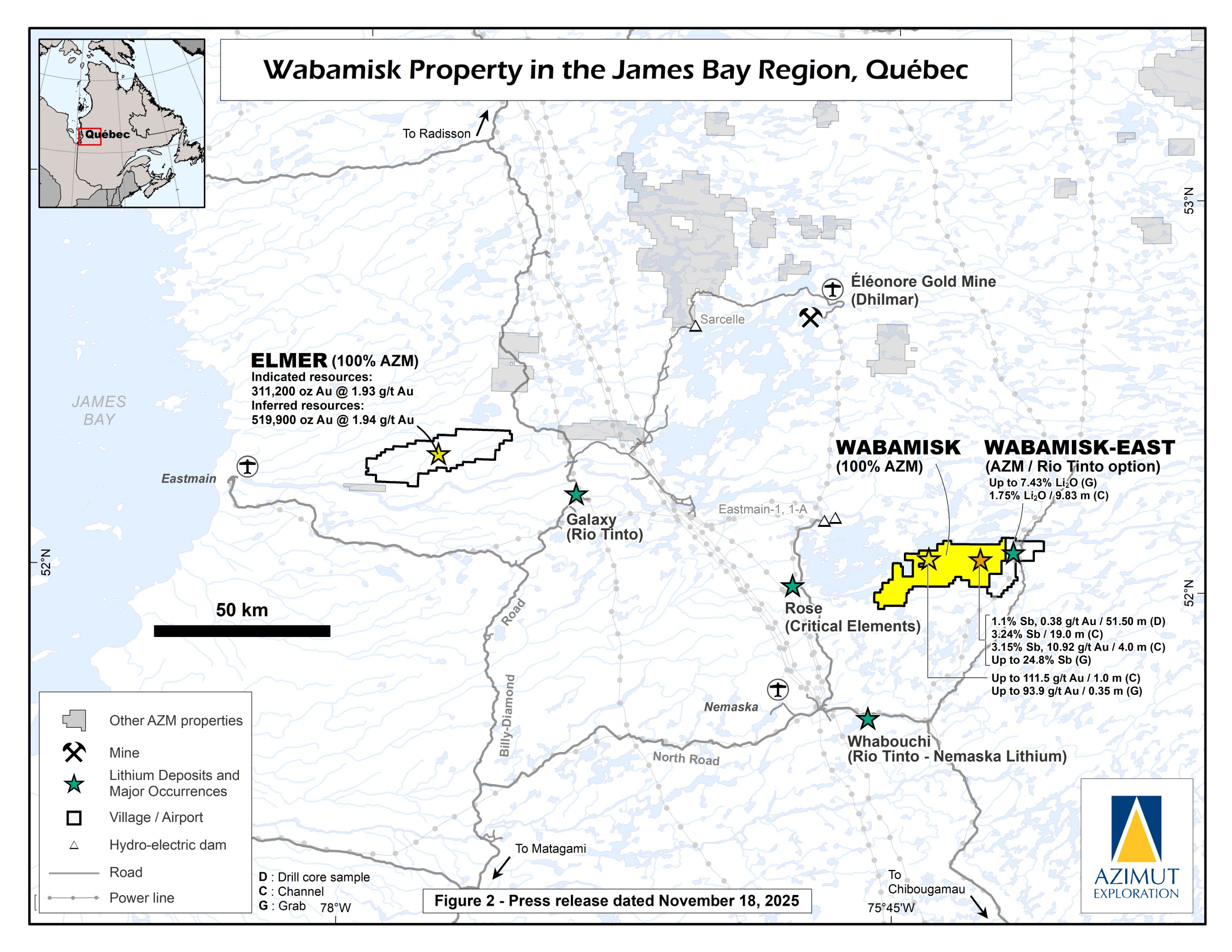 Azimut and Rio Tinto Expand Previous Agreements to Include Lithium Rights on Wabamisk East Property, James Bay Region, Quebec
