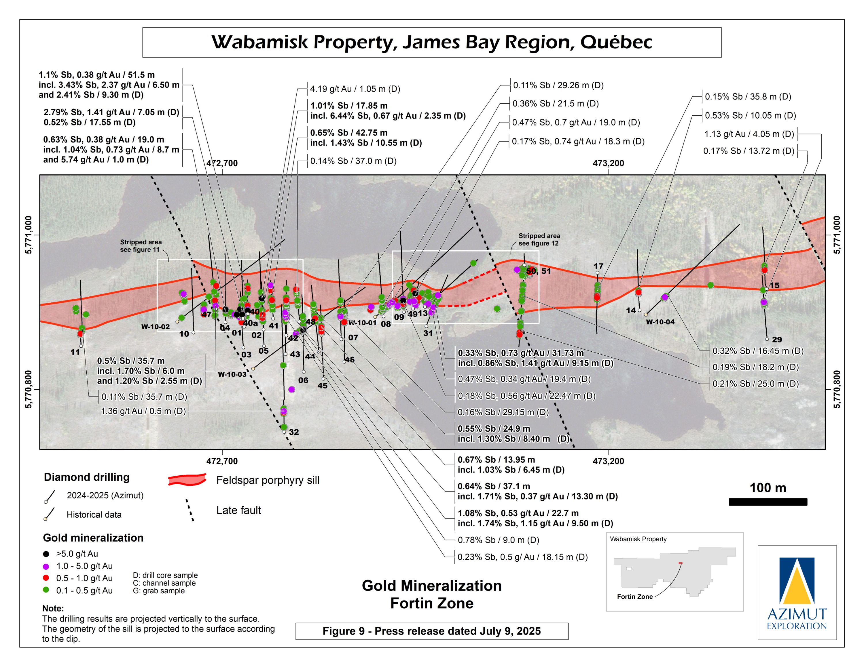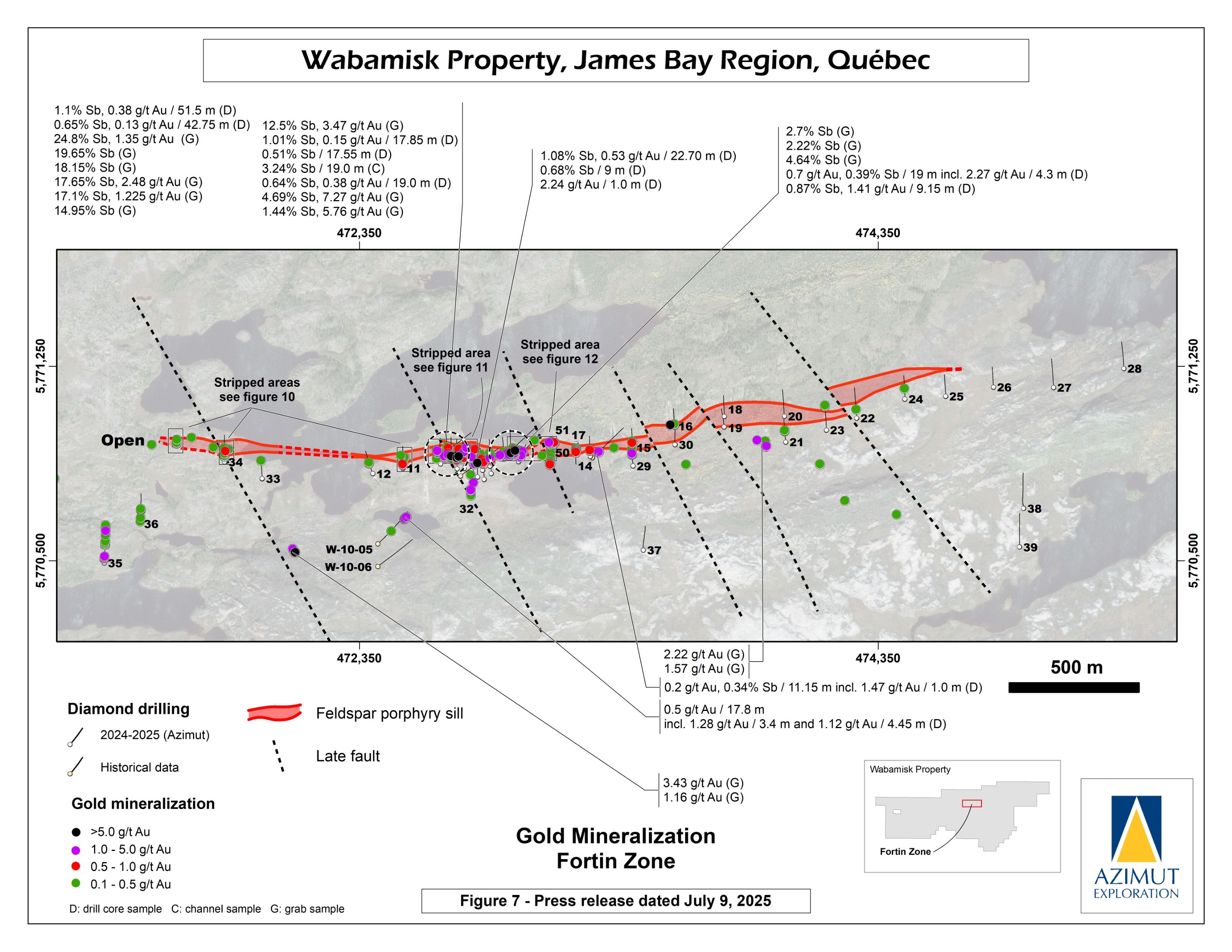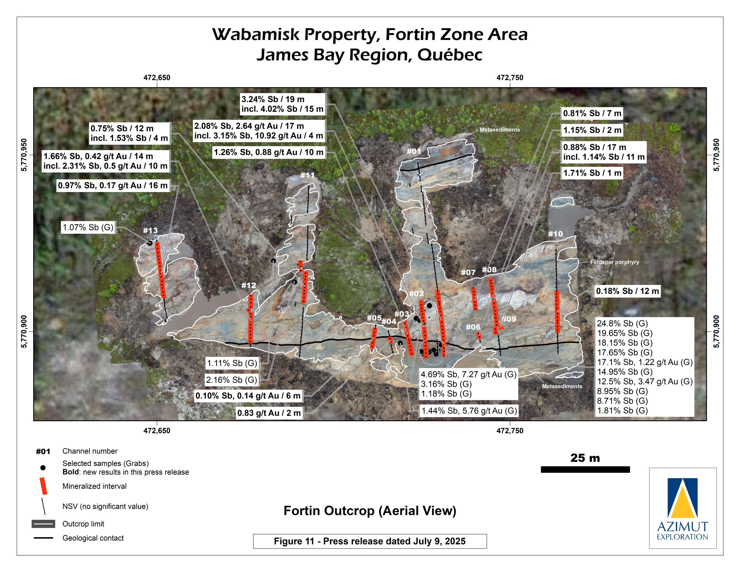 High-grade gold (up to 36.5 g/t Au over 1 m in channel WS25-02) associated with antimony was also uncovered further supporting that the gold potential of the Fortin Zone may increase at depth, a pattern already observed in other antimony-gold deposits worldwide.