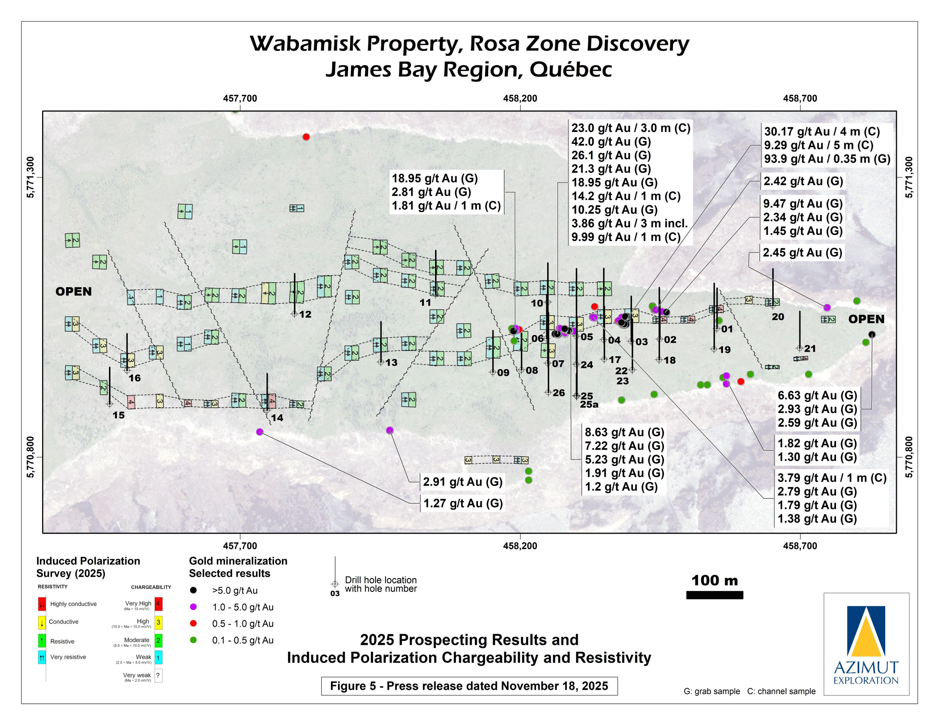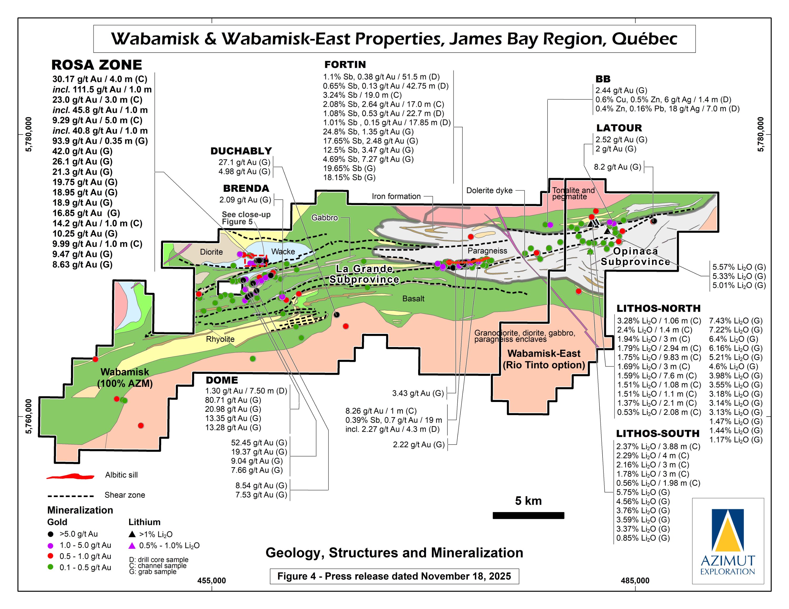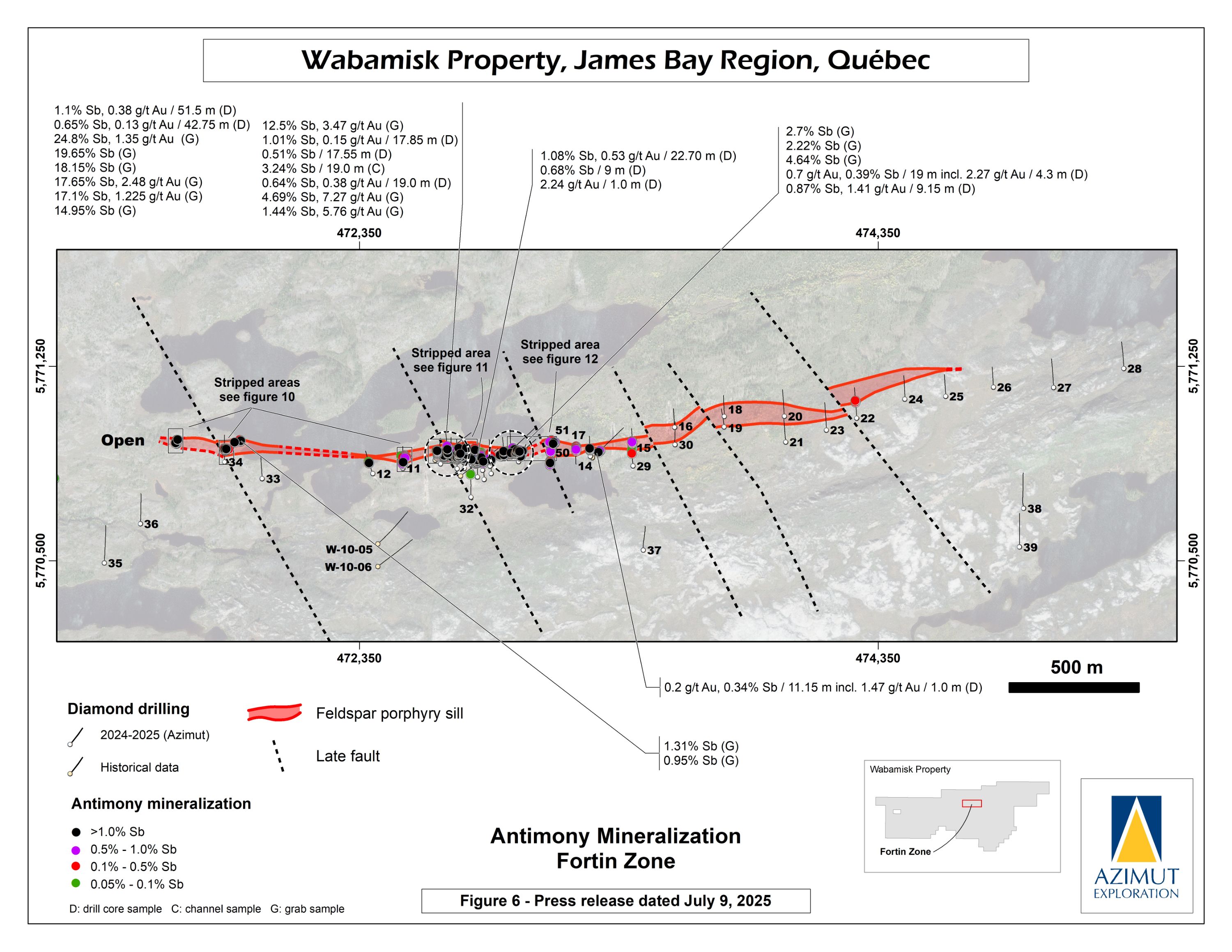 In October 2024, Azimut announced the discovery of a high-grade antimony corridor on the property with channel samples (3.92% Sb over 14.0 m) and numerous high-grade grab samples (up to 24.8% Sb) collected along a 1.2-kilometre-long strike within the Fortin Zone. Gold (up to 7.27 g/t Au in grabs) commonly accompanies antimony. Note that grab samples are selective by nature and unlikely to represent average grades. Geoscientific data (prospecting, induced polarization and magnetism, lake sediment, till and soil geochemistry) support a minimum 3.5-kilometre length for the antimony-gold exploration corridor. Significant additional work is needed to appraise its full potential.