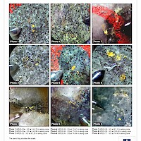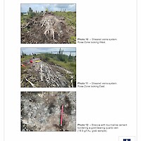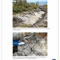 From 2012 to 2015, Newmont funded work programs that included prospecting (651 grab samples), a soil geochemistry survey (3,890 samples), an IP survey over altered shear zones that warranted additional work, and a high-resolution helicopter-borne magnetic survey (3,502 line-km). These programs led to the discovery of a new prospective area in the western part of the property characterized by gold-in-soil anomalies and an assay of 12.45 g/t Au from a quartz vein in a grab sample. Other prospecting results included 2.42% Cu, 0.41 g/t Au and 23.6 g/t Ag (grab sample); 1.42% Cu and 7.1 g/t Ag (grab sample); and 1.01% Cu, 0.67 g/t Au and 9.1 g/t Ag (boulder).