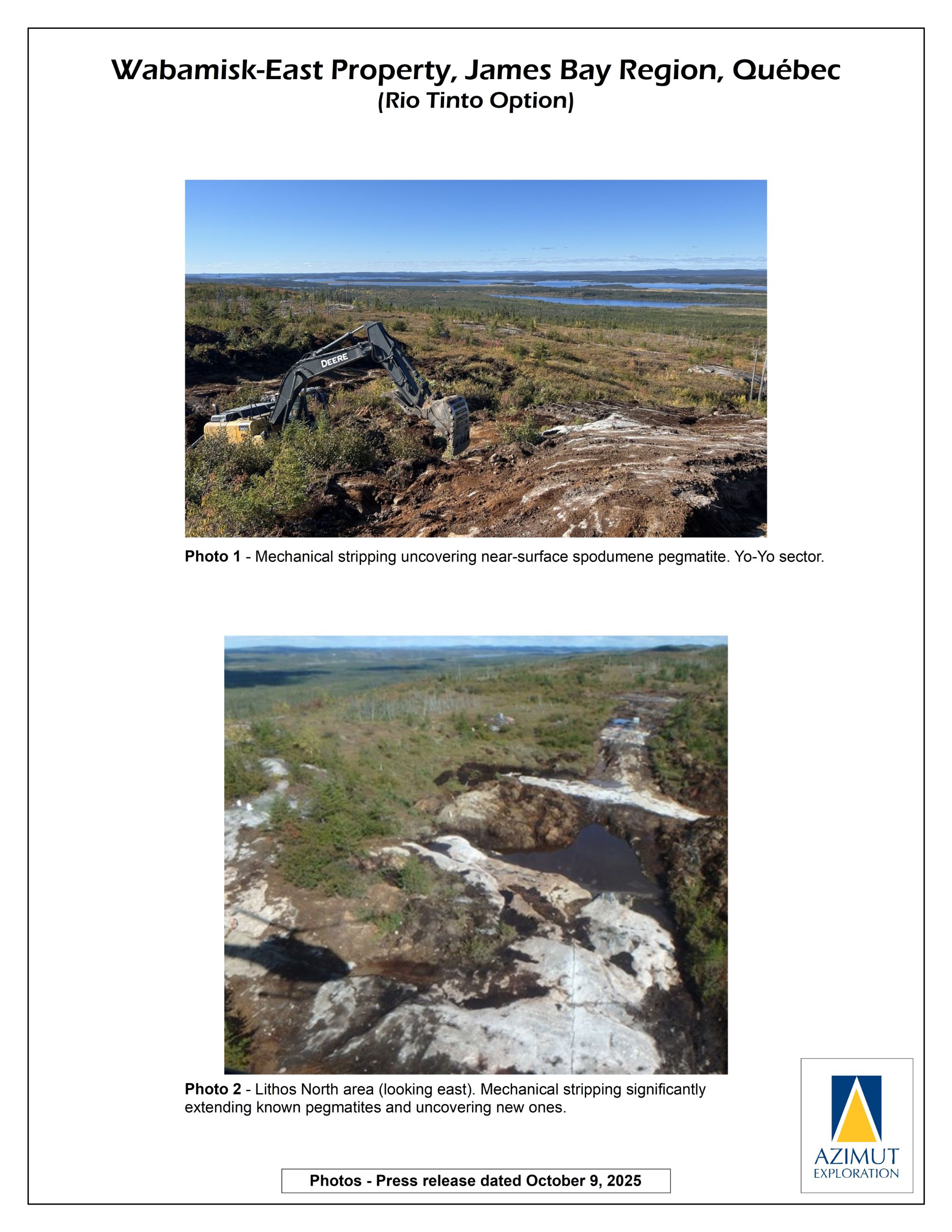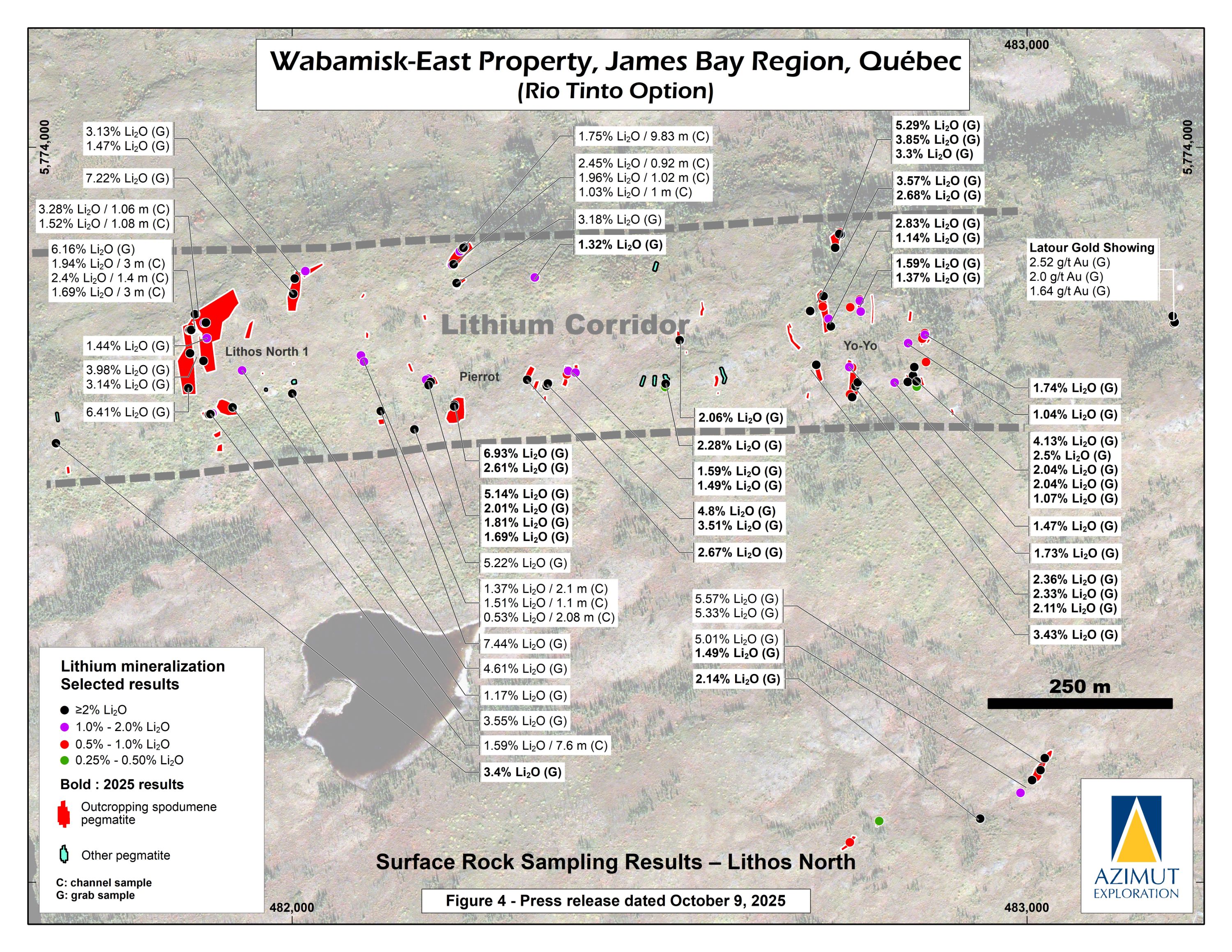 Since regaining full control of the Property, Azimut reprocessed the property’s large database to rank exploration targets. The 2024 prospecting program revealed an antimony-rich system but also a strong potential for lithium, with an extensive spodumene pegmatite field identified.